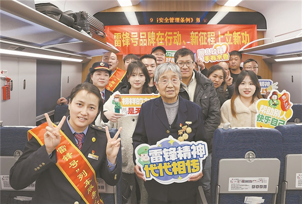 3月5日,“雷鋒號(hào)”列車上迎來一位特殊旅客。全國(guó)勞動(dòng)模范、“雷鋒號(hào)”列車第一代列車員王漢云在列車上向乘務(wù)員和旅客宣講雷鋒精神。